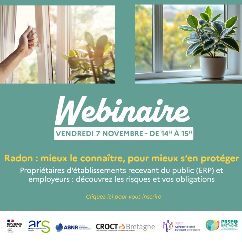 Dans le cadre du Plan régional santé environnement 4 et du Plan régional santé travail, l’ARS, la DREALet la DREETSde Bretagne, en partenariat avec l’ASNR vous invitent à ce webinaire.